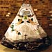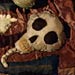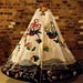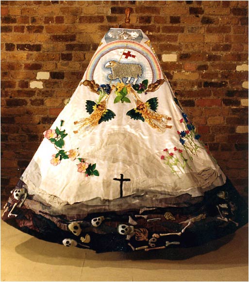On the front flowers, birds, and angels soar upwards from Golgotha on Easter morning. The neck is closed by an enamel clasp of doves. On the back the Lamb of God strides beneath a rainbow’s arch. Around the foot of the cope three dimensional silk skulls and bones are strewn on the grey silk and velvet earth. The embroidery is real gold and real silver |